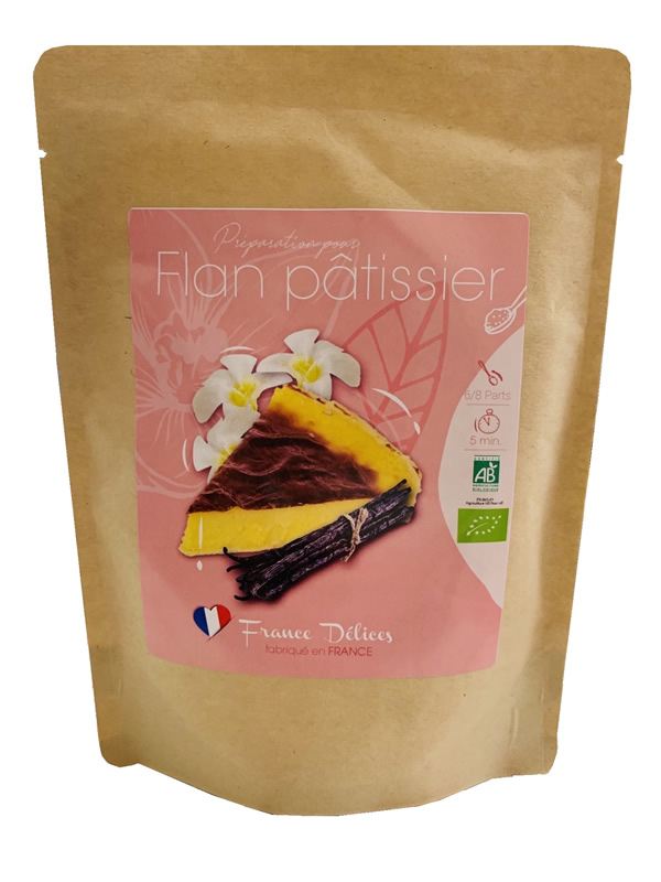 Chauffer 1litre de lait (végétal ou animal) dans une casserole, et incorporer doucement la préparation dessert tout en remuant jusqu’à épaississement. Puis enfourner dans un moule beurré à 210°C pendant 25min.