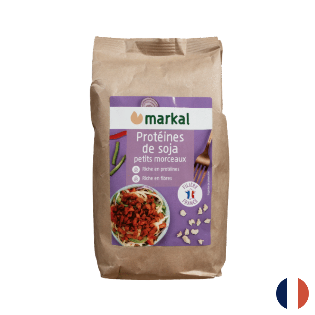 Les protéines de soja petits morceaux seront idéales en remplacement de la viande hachée dans de nombreuses recettes : hachis Parmentier, lasagnes, farces à légumes, sauces bolognaise, steak végétal… Réhydrater 20g de protéines de soja par personne dans 2 à 3 fois leur volume d’eau chaude pendant 10 min et les ajouter ensuite à votre recette. A conserver dans un endroit frais, sec et à l’abri de la lumière.