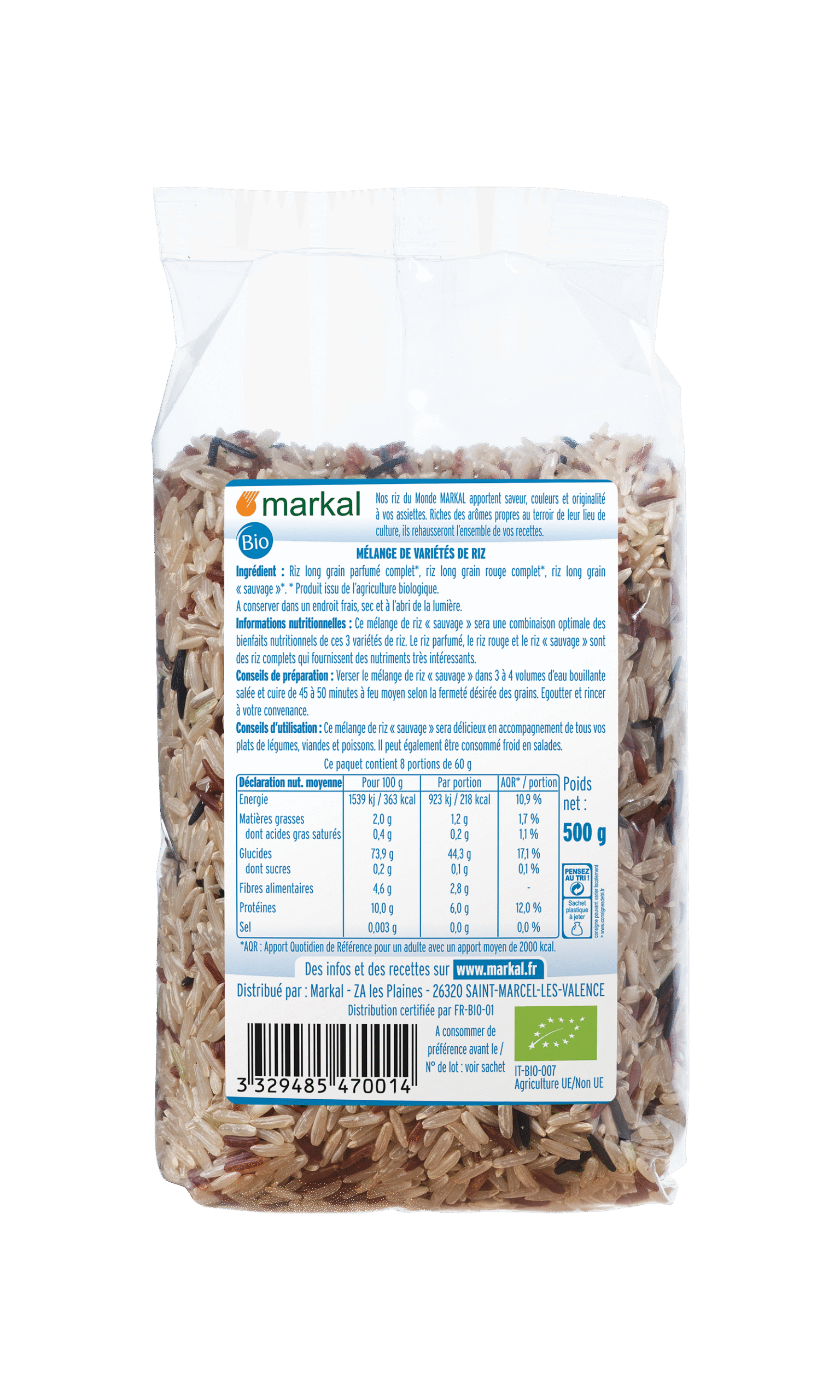 Riz long grain parfumé complet*, riz long grain rouge complet*, riz long grain « sauvage »*