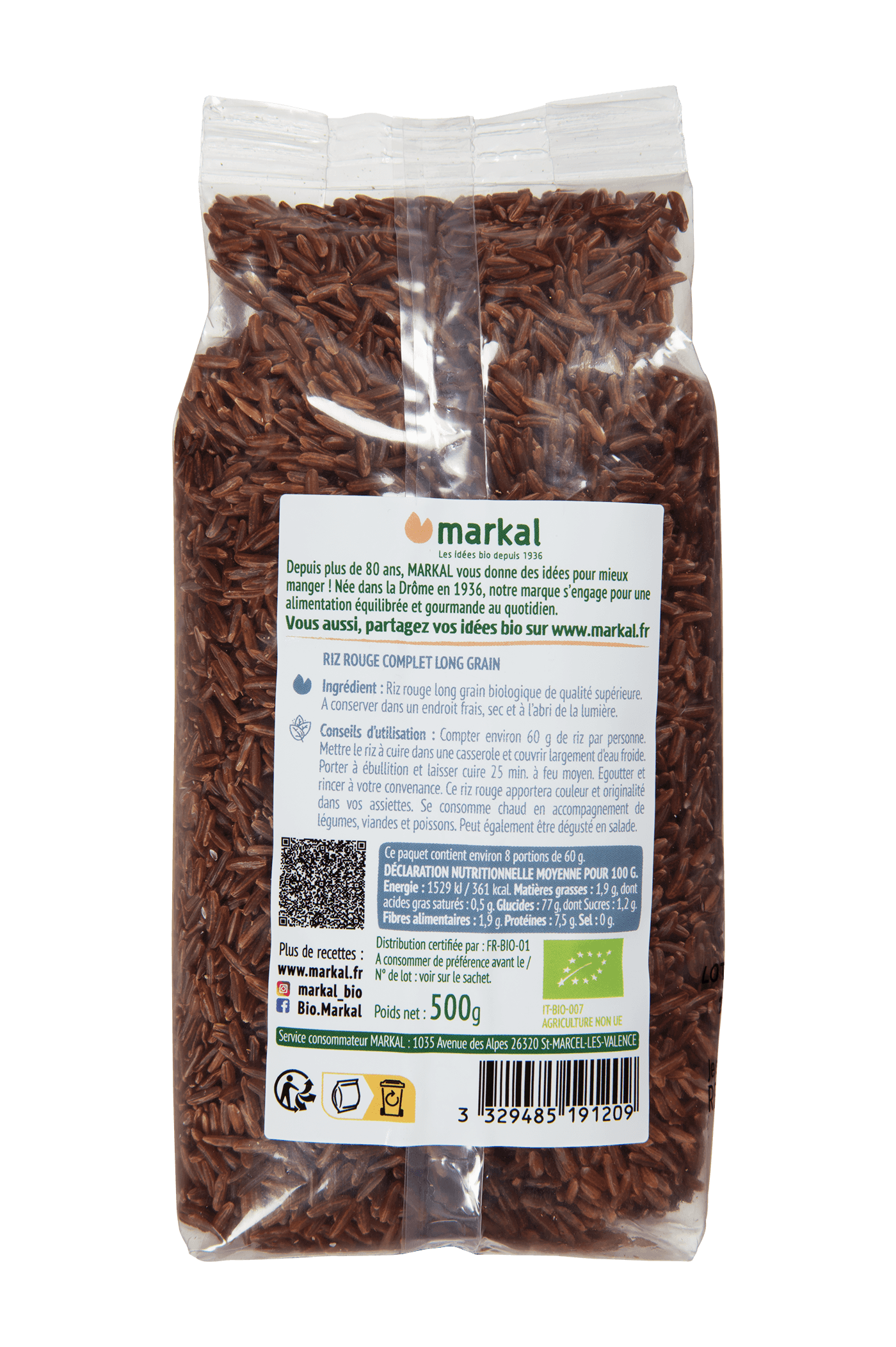 Compter environ 60 g de riz par personne. Mettre le riz à cuire dans une casserole et couvrir largement d’eau froide. Porter à ébullition et laisser cuire 25 min à feu moyen. Egoutter et rincer à votre convenance. Ce riz rouge apportera couleur et originalité dans vos assiettes. Se consomme chaud en accompagnement de légumes, viandes et poissons. Peut également être dégusté en salade. A conserver dans un endroit frais, sec et à l’abri de la lumière.