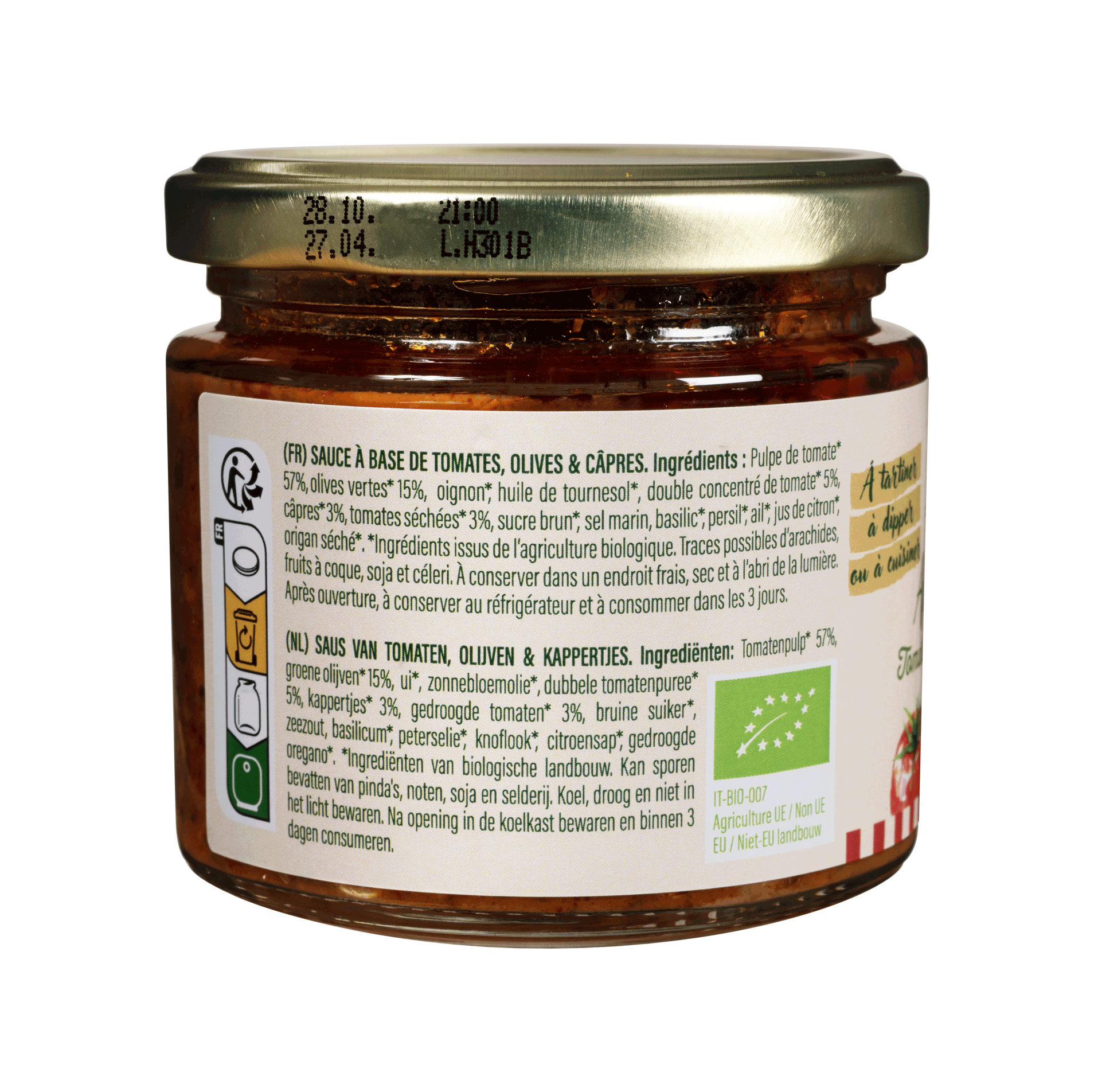 Pulpe de tomate* 25%, olives vertes* 15%, oignon*, huile de tournesol*, double