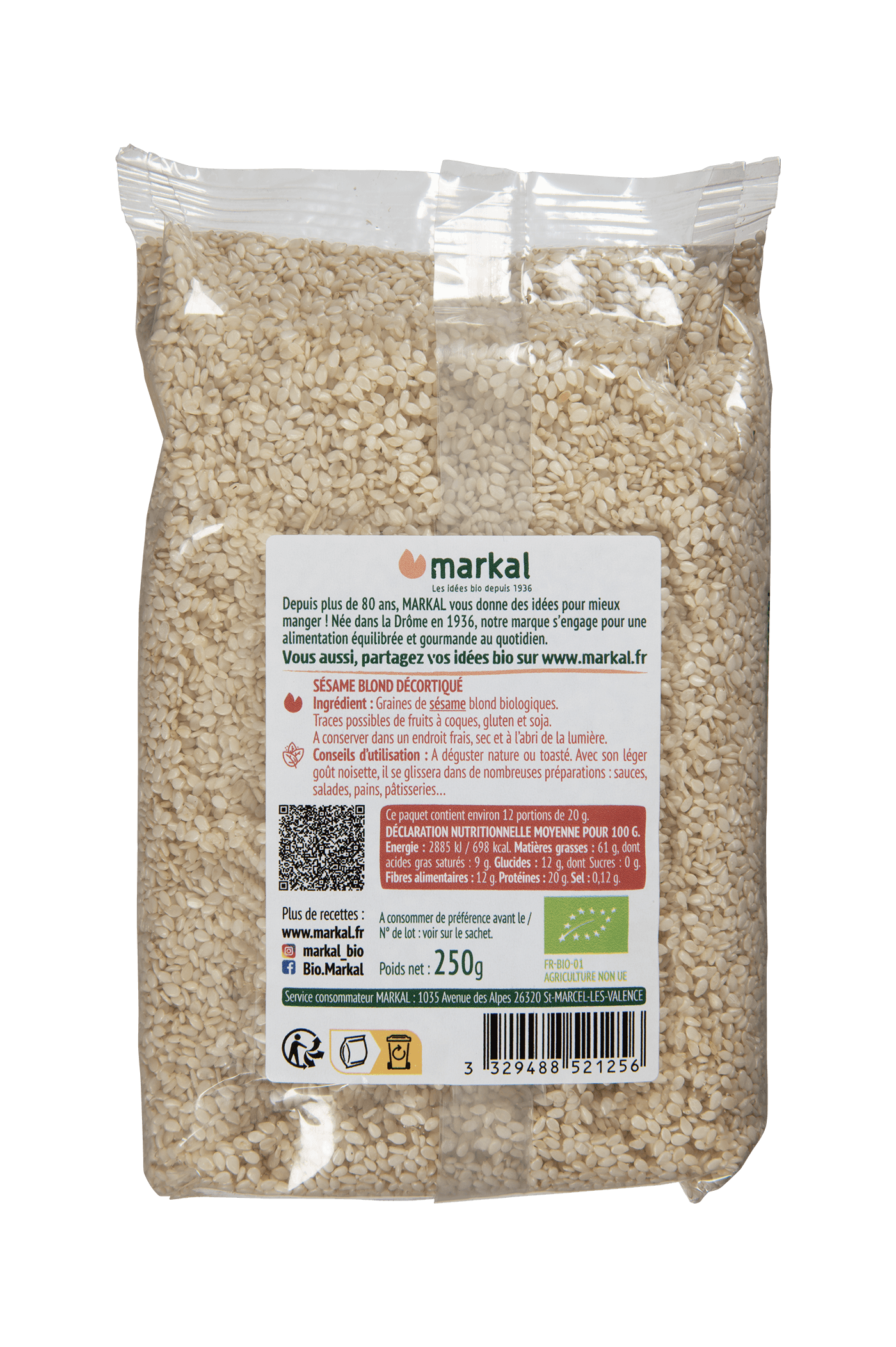 A déguster nature ou toasté. Traditionnellement utilisé pour la conception du « tahin » (purée de sésame) et du « gomasio » (condiment associant sel et sésame), le sésame décortiqué, au léger goût noisette, se glissera dans de nombreuses préparations : sauces, salades, plats cuisinés, pains, confiseries et pâtisseries. A conserver dans un endroit frais, sec et à l’abri de la lumière.