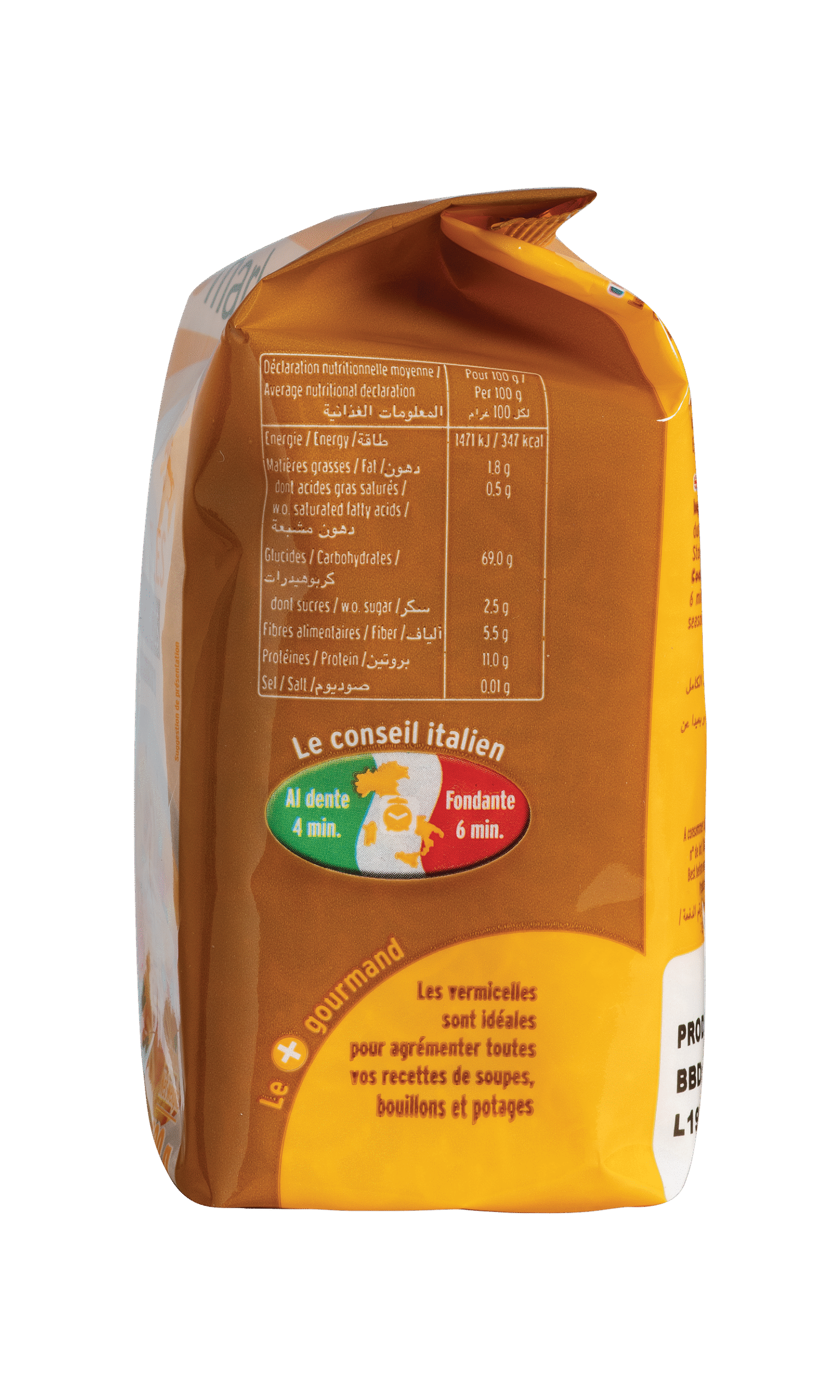 Faire cuire les pâtes entre 4 et 6 min dans un volume d’eau bouillante et salée. Egoutter et assaisonner à votre goût. Le conseil Italien : 4 min pour des pâtes Al dente, 6 min pour des pâtes fondantes. Les vermicelles sont idéales pour agrémenter toutes vos recettes de soupes, bouillons et potages. A conserver dans un endroit frais, sec et à l’abri de la lumière.